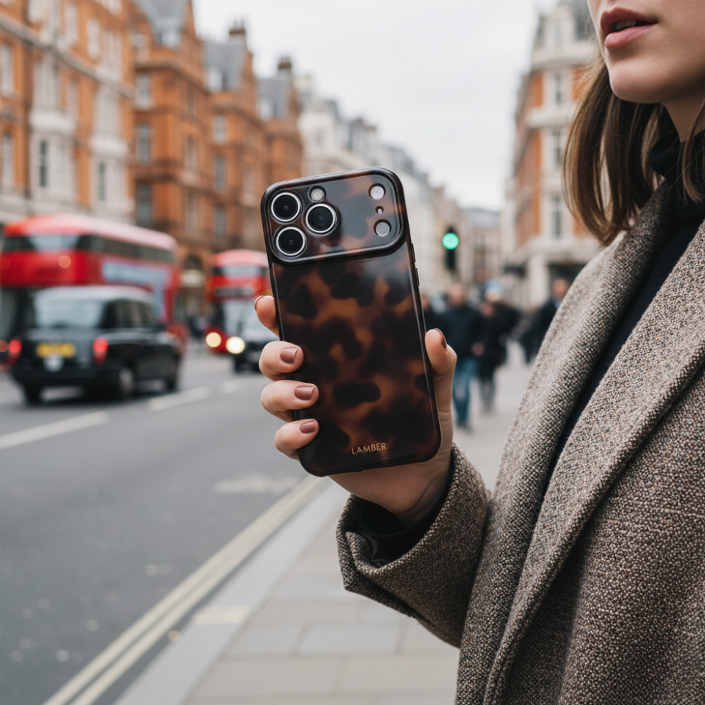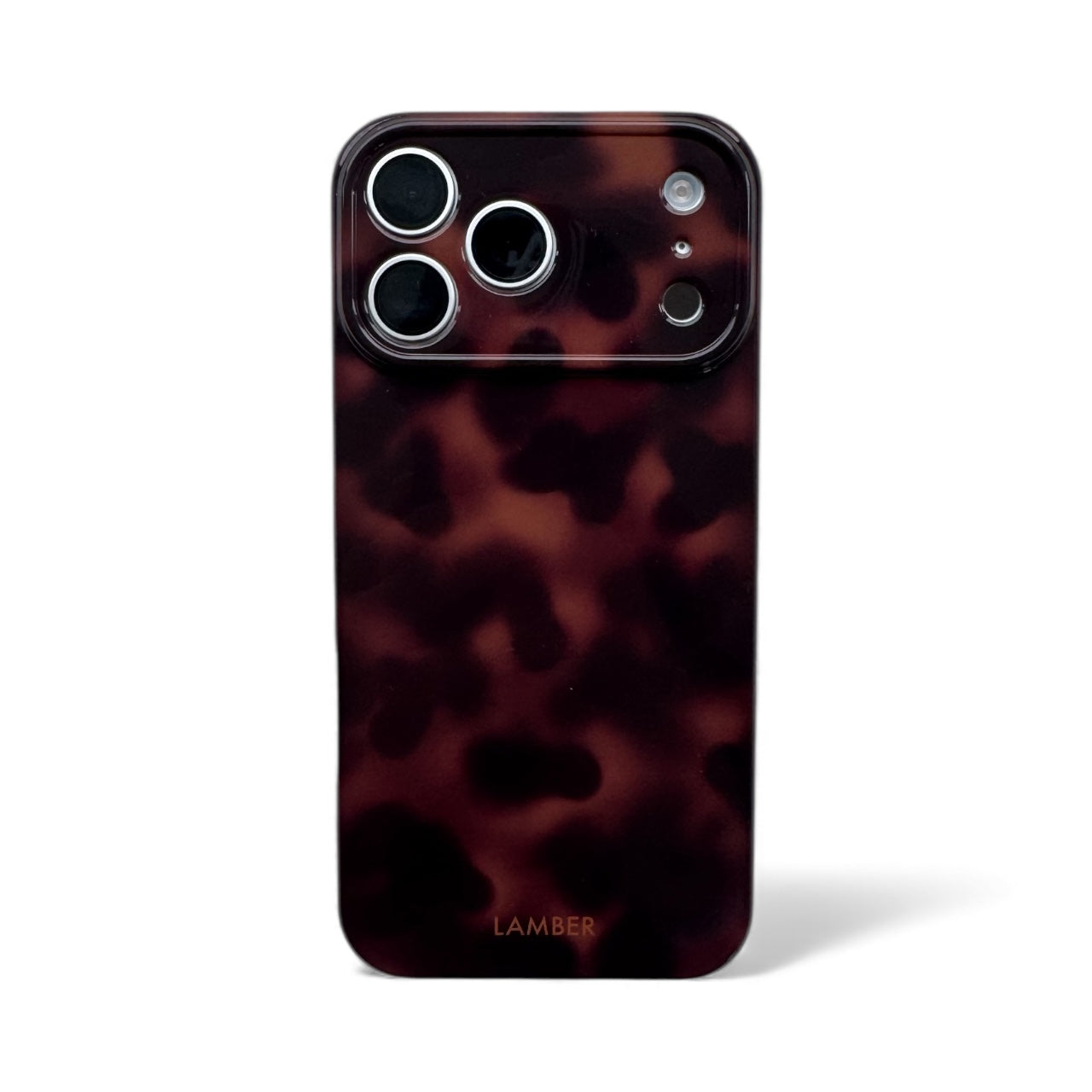 The Dark Leopard-print case features a sophisticated tortoiseshell pattern, blending rich, warm browns and deep, dark amber tones. Its glossy finish enhances the natural-looking, organic swirls and spots, giving it a luxurious and timeless appeal. Designed for a modern smartphone, it includes precise cutouts for the camera lenses and flash, ensuring full functionality. The case's sleek profile suggests good protection while maintaining a stylish aesthetic.