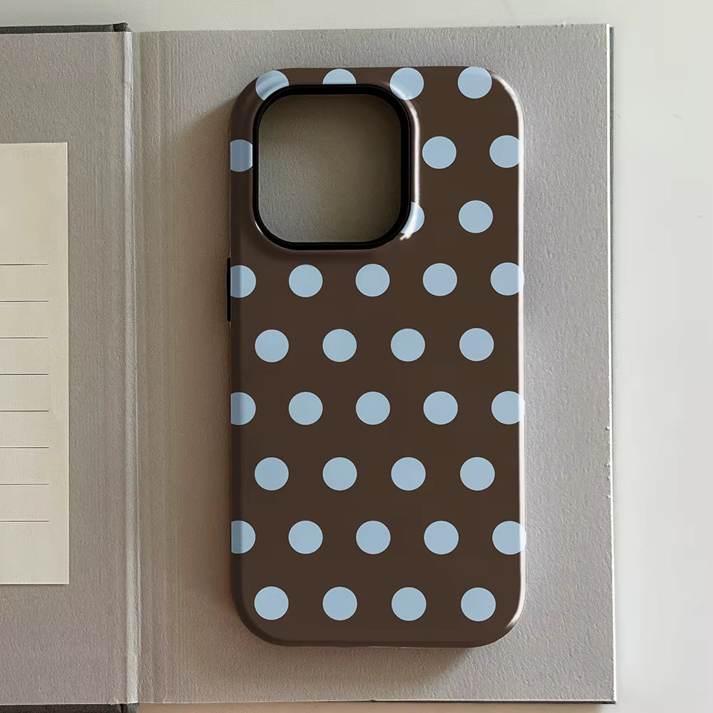 Channel a fun, modern-retro vibe with this chic polka dot phone case. The contrasting light blue dots pop against the deep brown, creating a visually appealing design that’s both fashionable and protective.
