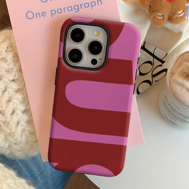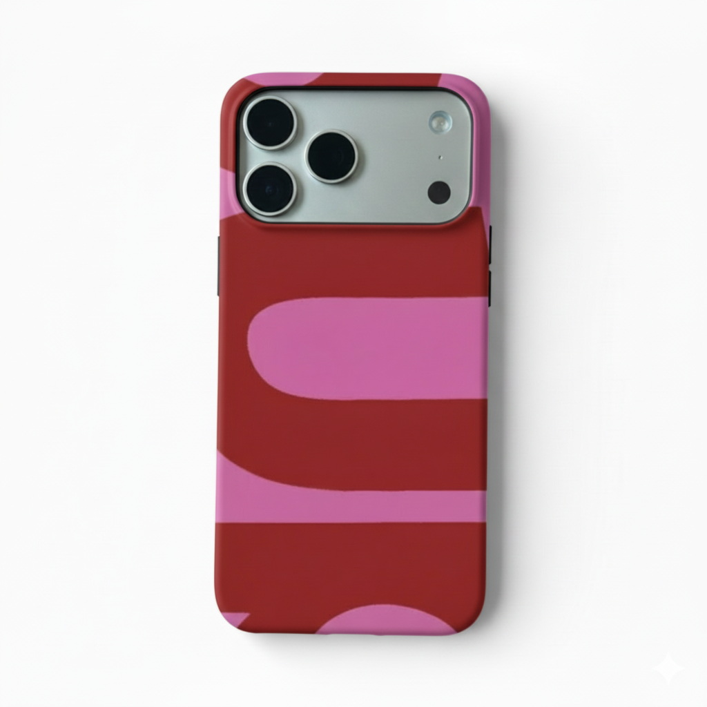 This phone case is a vibrant and playful accessory, immediately catching the eye with its bold, "groovy" design. It features an abstract pattern of thick, organic, wavy stripes in a striking combination of deep red and a lighter, vibrant pink. The contrasting colors and fluid shapes evoke a retro, psychedelic aesthetic, reminiscent of the 1960s and 70s. The case maintains a smooth finish, while its design includes a precise, dark rectangular cutout for a multi-lens camera system. This case is perfect for someone looking to express a fun, artistic, and nostalgic style while keeping their phone protected.